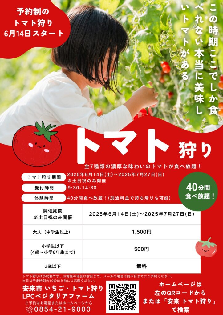 2025.05.20 いよいよトマト狩りの時期がやって参りました!! 6月14日よりトマト狩りを開催いたします🍅 ホームページからのご予約を開始いたしましたので、今年もトマト好きのみなさまのご来園をお待ちしております!! ※予約サイトを確認する 一覧へ 次へ >